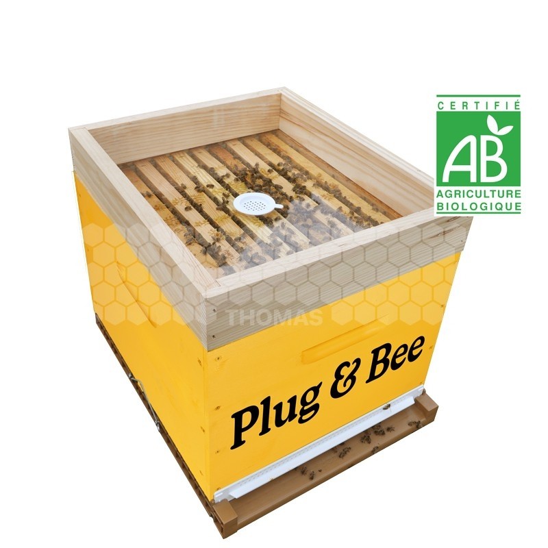 Plug & Bee BIO est la solution la plus simple et la plus rassurante pour débuter en apiculture. L’essaim et sa reine marquée en bleu sont installés préalablement directement dans une ruche par un professionnel.