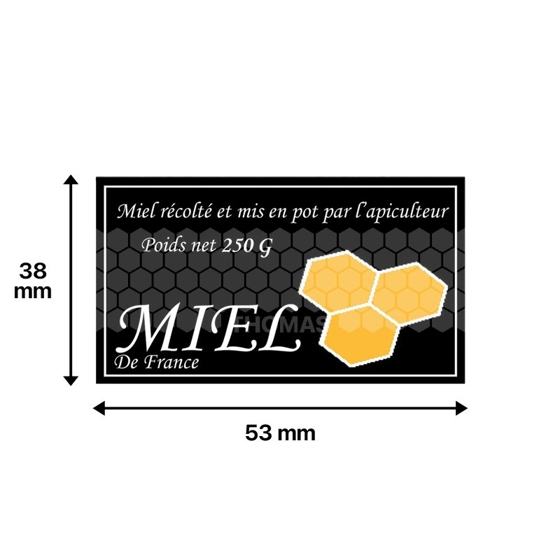 Ces étiquettes contiennent la mention « miel récolté et mis en pot par l’apiculteur » et les différents poids en fonction de votre choix.