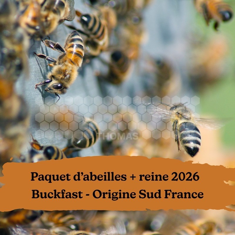 Paquet d'abeilles avec reine 2026 origine Sud France dans une boîte non consignée (environ 1,5 kg d’abeilles), destiné à un public souhaitant peupler différents modèles de ruches Dadant, Langstroth, Voirnot, Warre et Kenyanes.