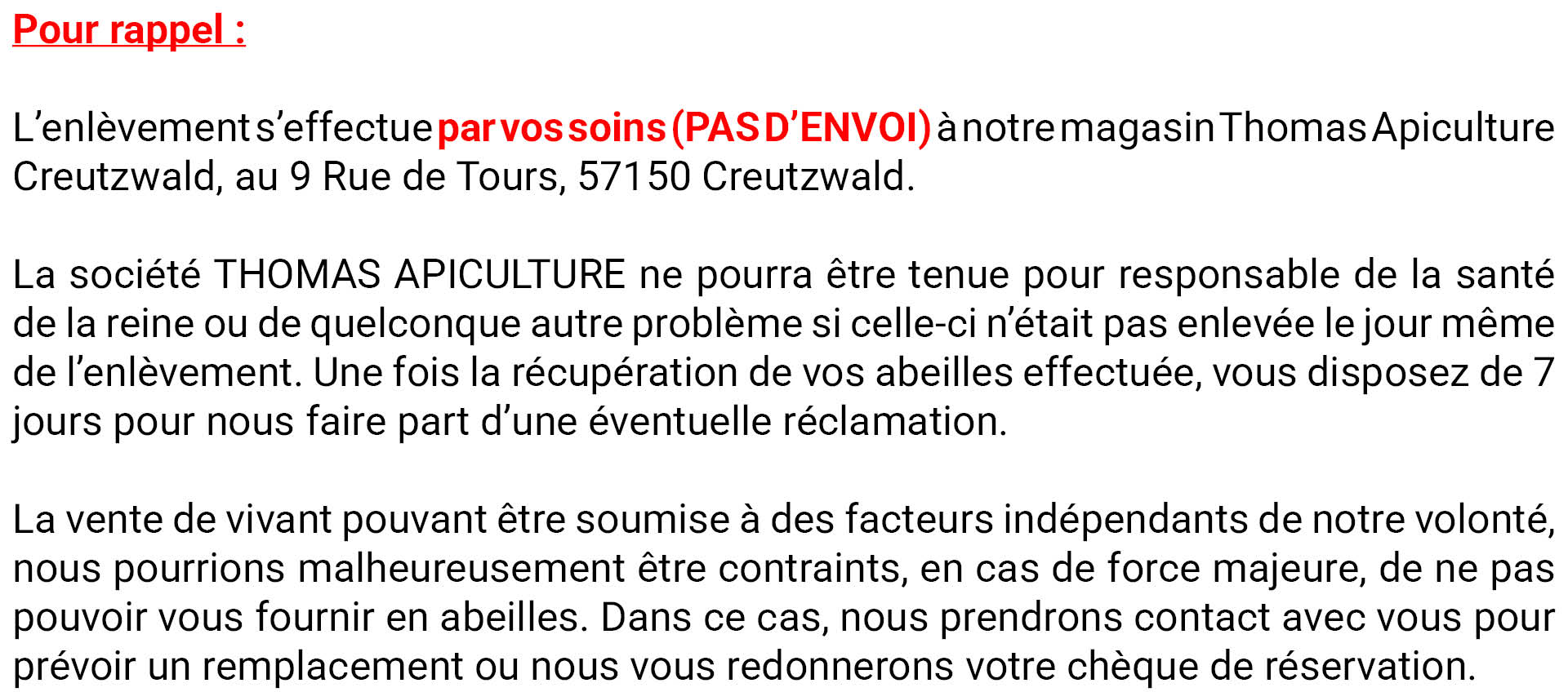 Vous souhaitez vous faire livrer vos reines ? Contactez-nous au 03 55 15 30 00 pour définir le coût d’envoi et la date de livraison.