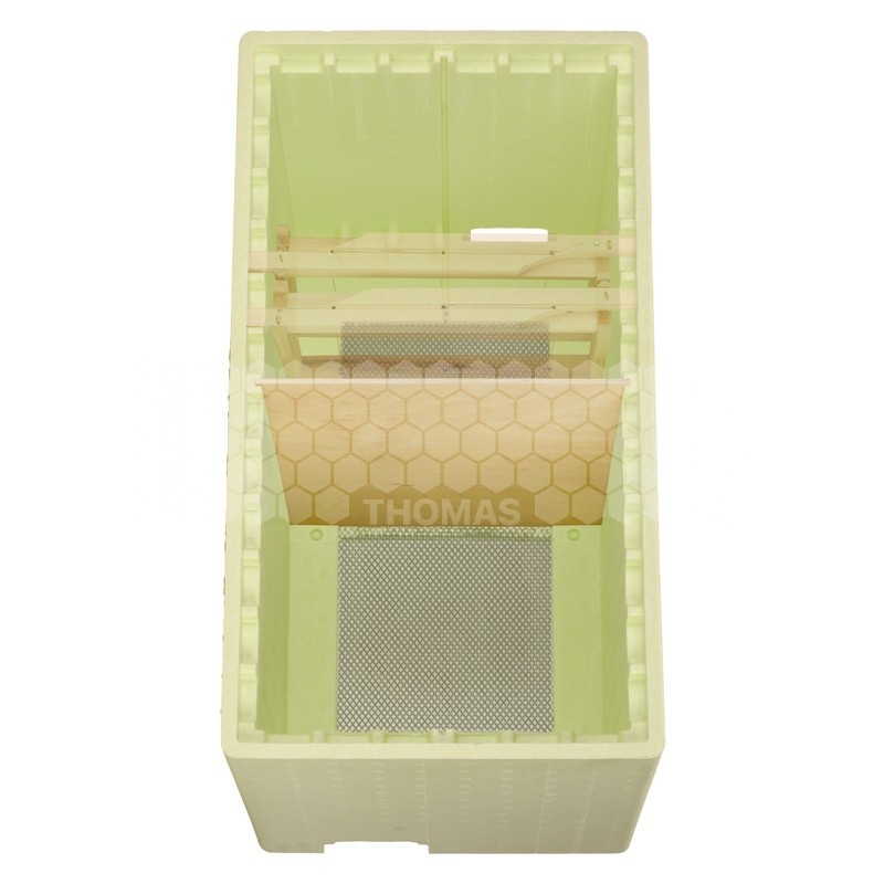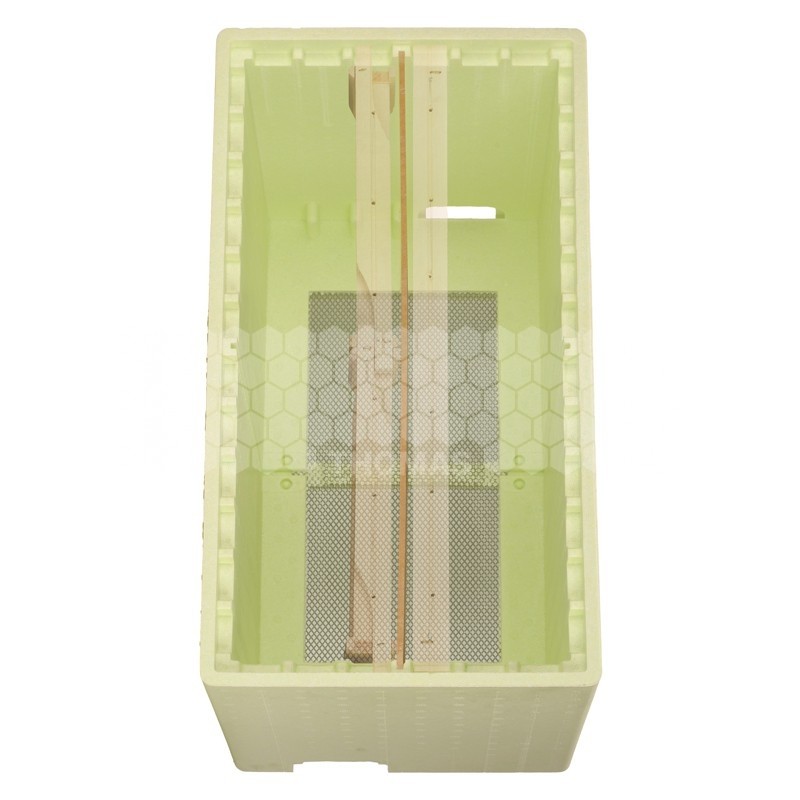 Ruchette Dadant DUO NOVAPI en polystyrène haute densité. Possibilité de placer 12 demi-cadres en largeur ou 6 cadres en longueur (ruchette séparée en deux par une plaque de séparation). Cette ruchette est idéale pour transporter les essaims (avec toit grillagé) ou bien les mettre en hivernage (avec toit plein). En effet, le polystyrène HD résiste parfaitement aux intempéries et ainsi qu'au froid.