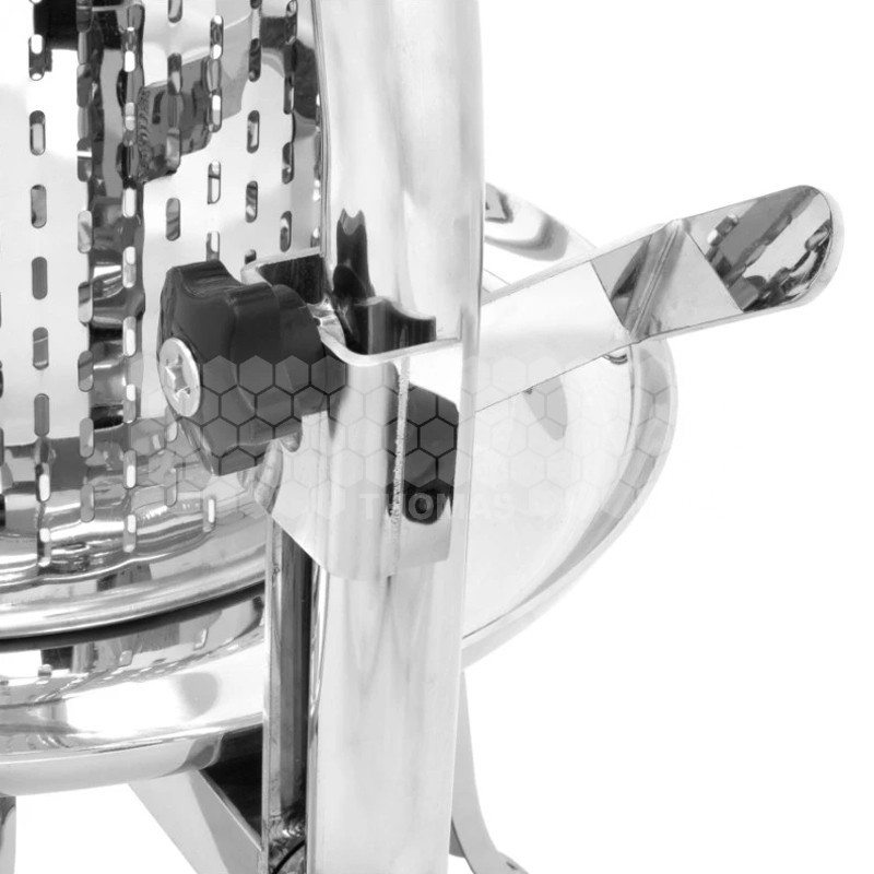Le panier perforé présente les dimensions suivantes : hauteur 35 cm, diamètre 25 cm, pour un volume utile d’environ 17 litres. Cette capacité permet de traiter des lots d’opercules adaptés aux besoins d’un rucher familial ou d’un atelier de miellerie. La hauteur sous sortie pour le miel est de 24 cm par rapport au sol, ce qui facilite le positionnement d’un récipient adapté pour recueillir le miel extrait.