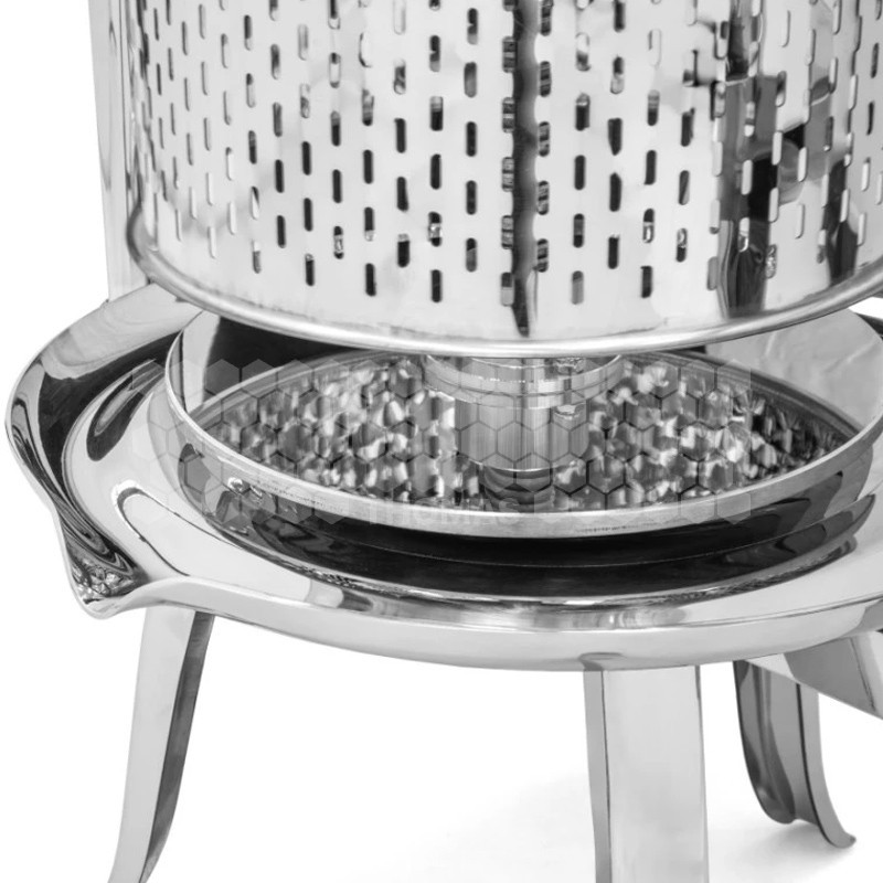 Il est livré avec un tamis nylon qui se loge directement dans le panier inox perforé. Ce tamis est spécialement prévu pour recevoir les opercules ou les rayons à presser, ce qui améliore la séparation du miel et de la cire tout en facilitant le nettoyage après utilisation.