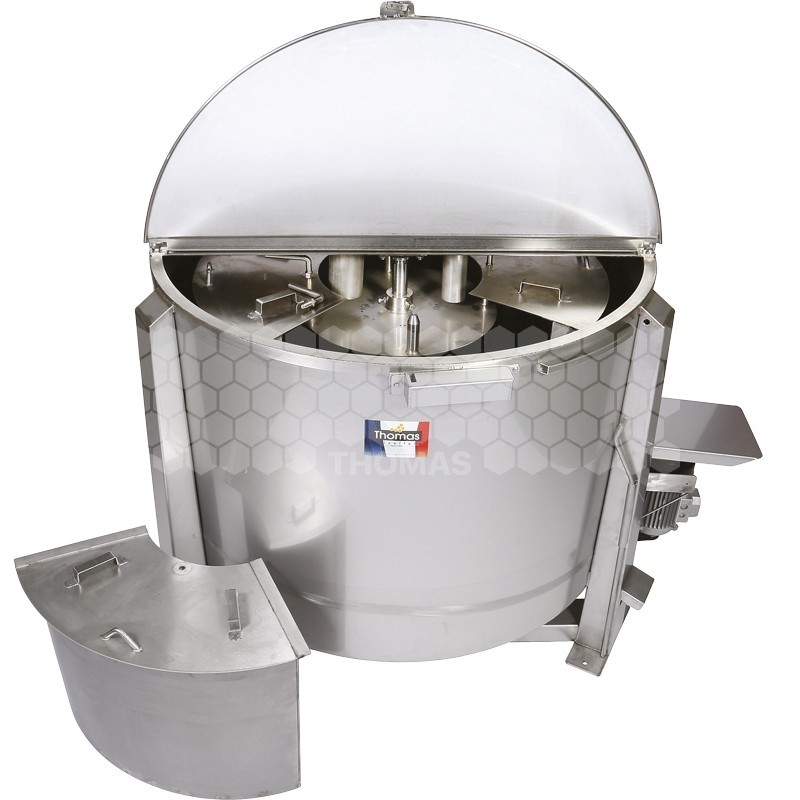 La Spinomel 1000-1500 W de Thomas est conçue pour répondre aux exigences des mielleries professionnelles. Cette centrifugeuse tout inox permet de séparer efficacement le miel des opercules, tout en filtrant le miel extrait dans un cycle continu. Avec un diamètre de 1 000 mm et une hauteur de 1 210 mm, elle est idéale pour traiter les grandes quantités d’opercules et de miel issues des extracteurs.
